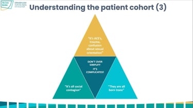 During the meeting Hilary Cass has shown a graphic (found below) and she said: "People want simple answers, on one side was it's all social contagion and people need to pull themselves together, Some people said, all of these young people were born trans and they were being denied, medical care.