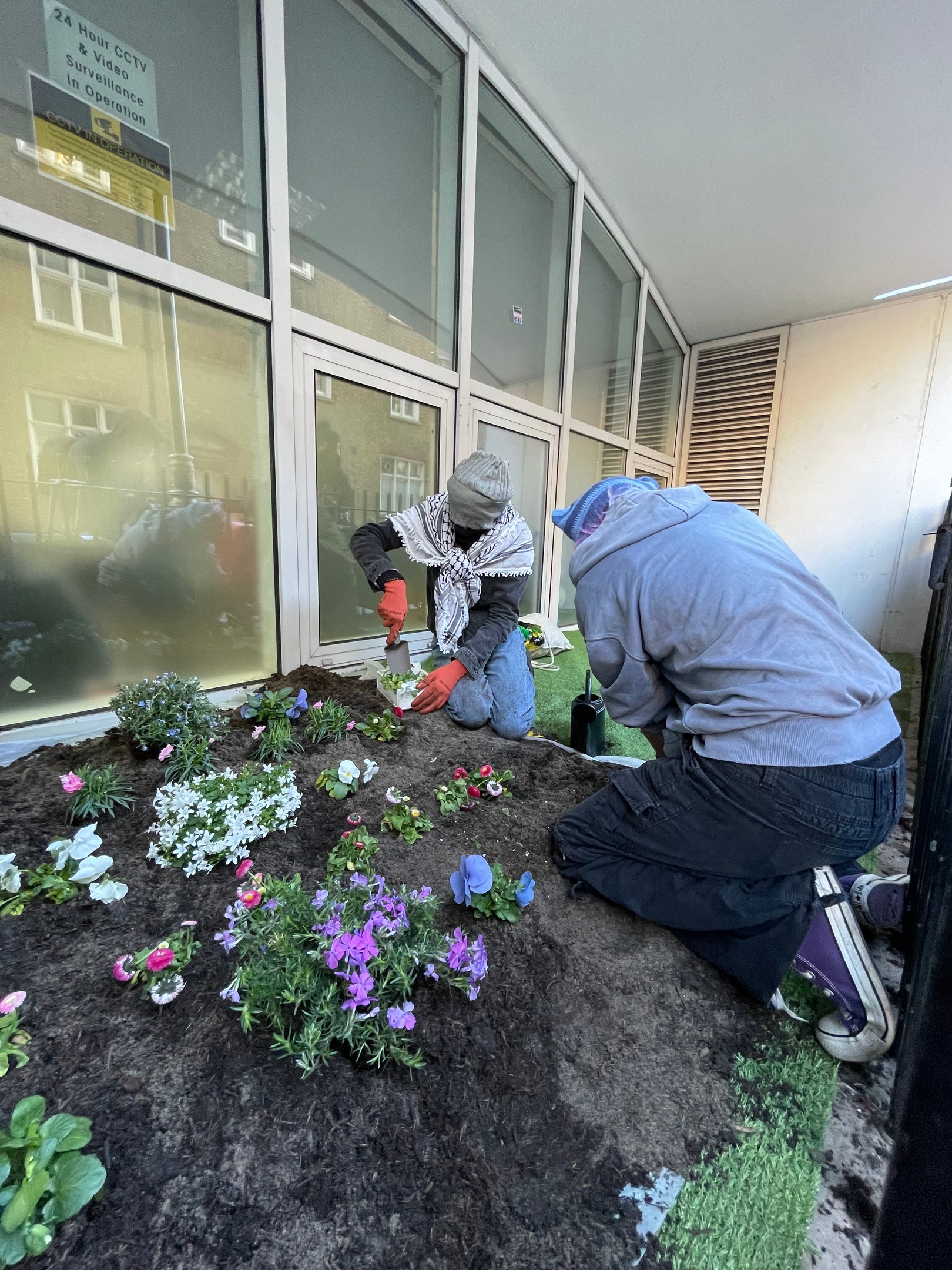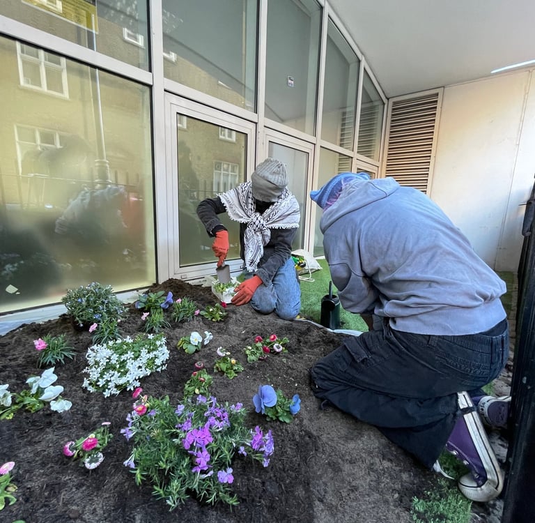 LONDON, 30 MAR 2026, 4:50pm— Young trans activists hopped into a grate outside the Department for Education, and planted an array of blue, pink and white flowers. This floral protest followed new guidance within Keeping Children Safe In Education 2026, which aims to limit social transition in school, prioritising the opinion of parents and teachers over the wellbeing of trans kids. While the flowers were planted, the suitcases used to bring the soil to the site were placed in front of the building, reading ‘LET TRANS KIDS BLOOM’. A final suitcase contained testimonies from trans kids about the life-changing benefits of being able to socially transition in school. There were also quotes from trans adults on how being unable to socially transition negatively impacted both their childhoods and later life.