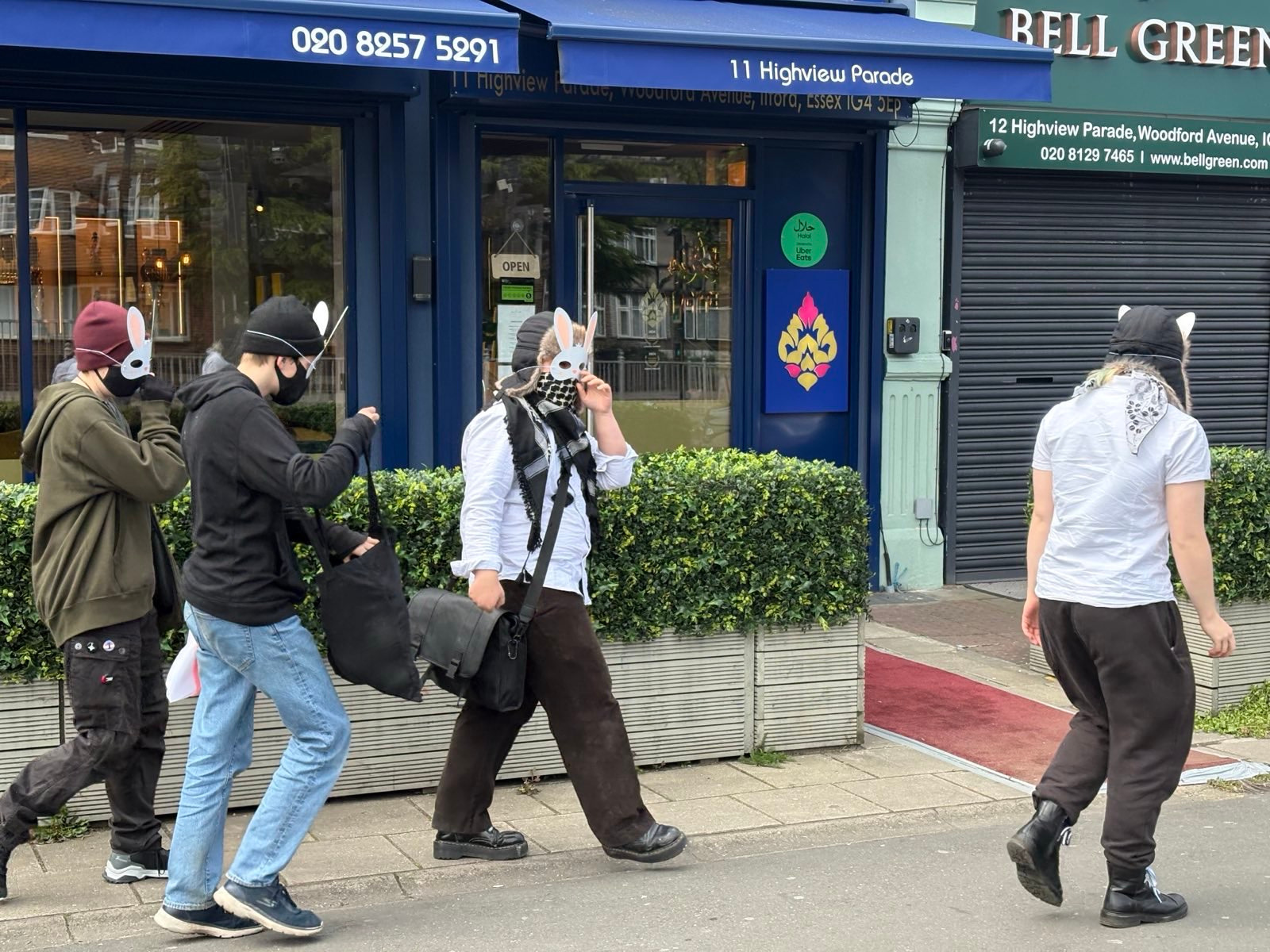 LONDON, OUTSIDE WES STREETING'S CONSTITUENCY OFFICE, 20 APRIL 2025: 4 young activists from Trans Kids Deserve Better dressed up as the Easter bunny and gave up their Easter Sunday to leave cardboard eggs outside Wes Streeting's constituency office in Ilford, London. These eggs, instead of being the chocolate ones they should be getting for Easter, were decorated cardboard written with the activists' demands to Wes Streeting.