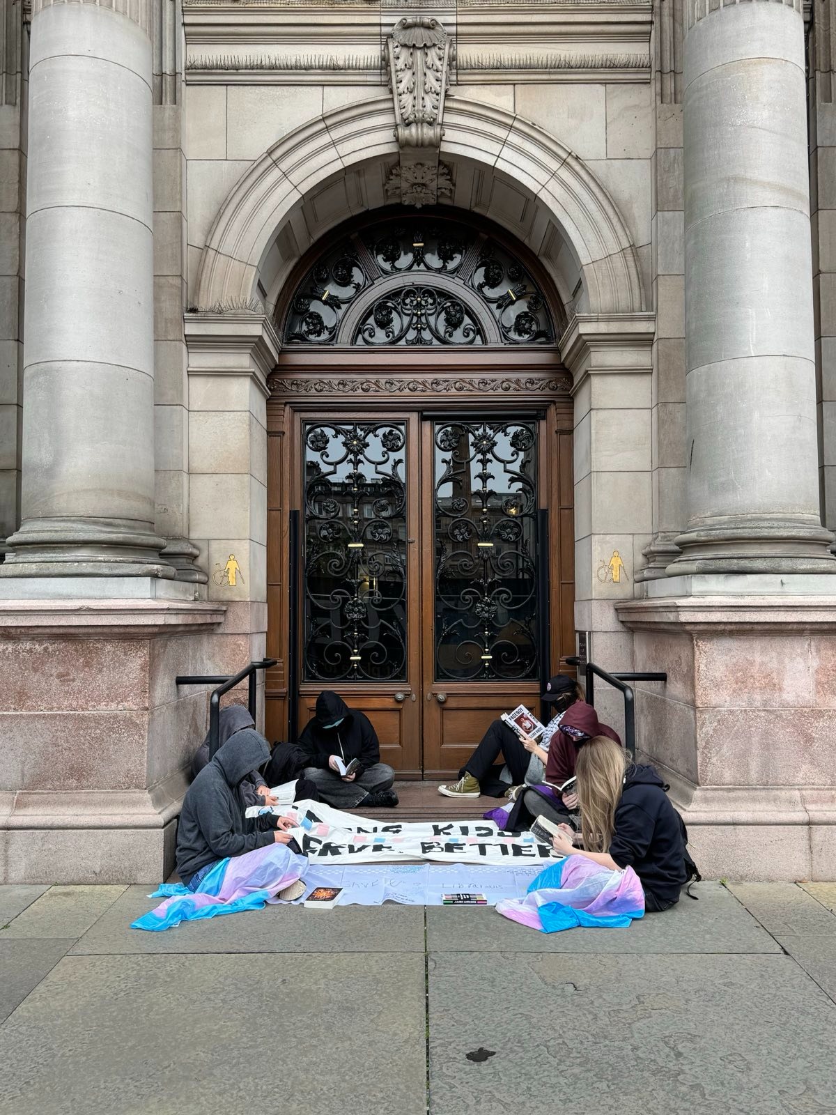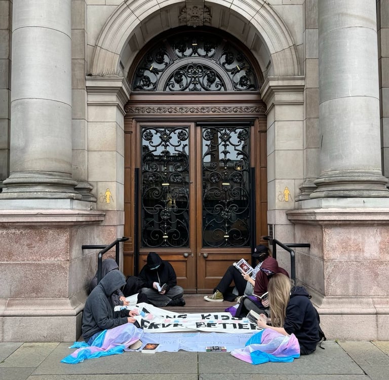 GLASGOW, 11 AUGUST 2025, 11:15AM— Six activists from the direct action network Trans Kids Deserve Better (TKDB) Scotland staged a second 'read-in' at Glasgow City Chambers after attempts to reach out to Susan Aitken, the Leader of Glasgow City Council.