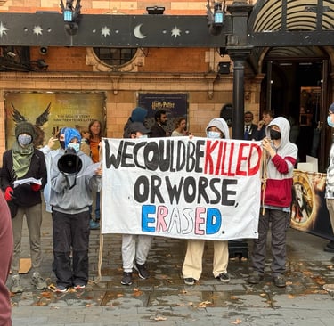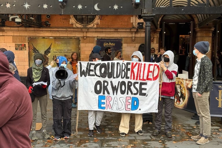 LONDON, 29 AUGUST, 5:50PM: Four young activists from Trans Kids Deserve Better attempted to scale the Palace Theatre, where Harry Potter and the Cursed Child is currently playing. They gave speeches on the ground imploring the public to stop funding J.K Rowling.