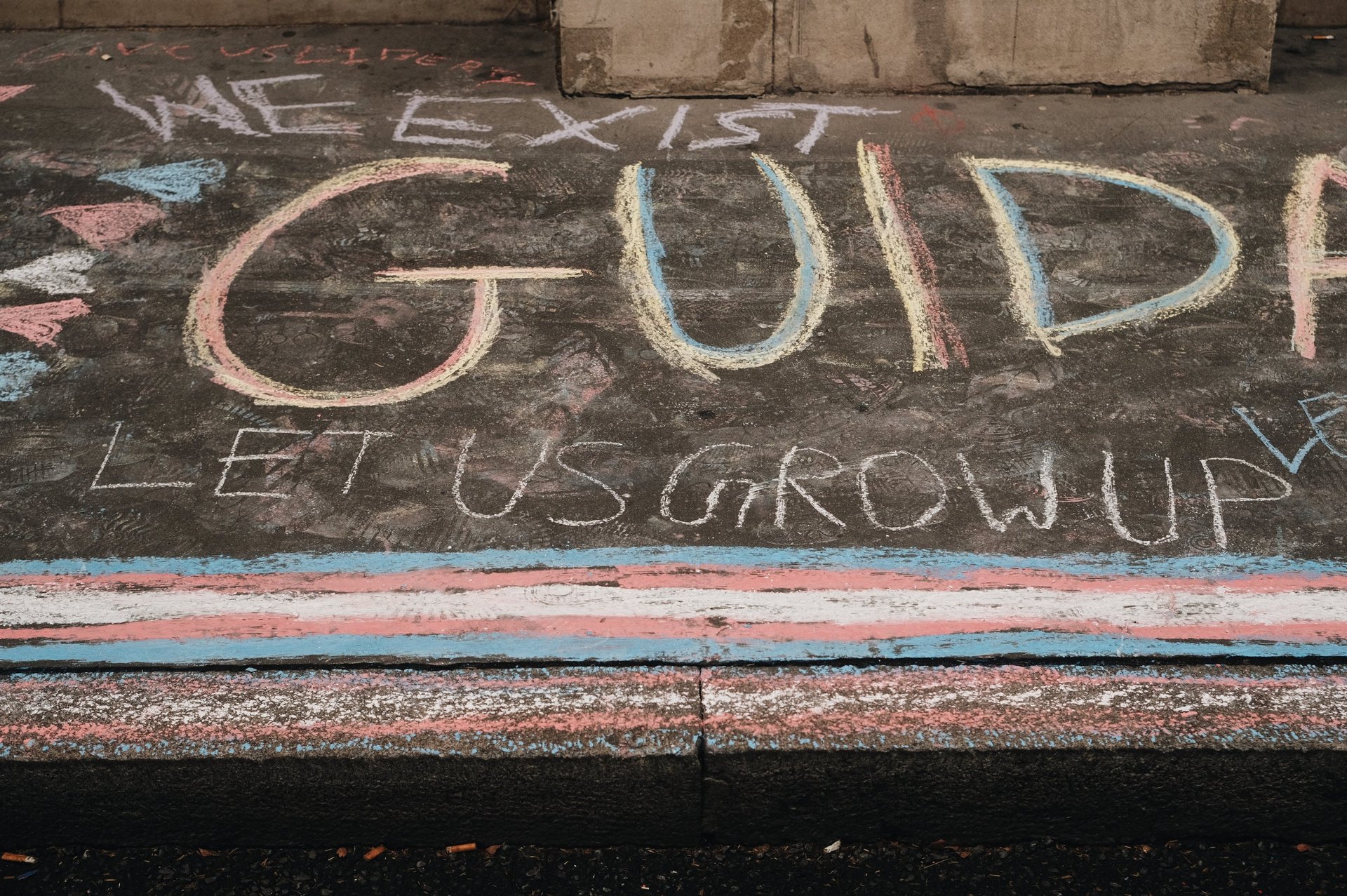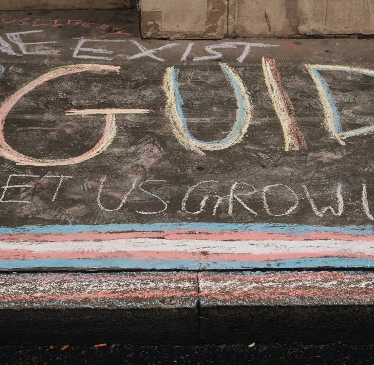 DEPARTMENT FOR EDUCATION, 26th August 2025, 1:00PM — This afternoon, 7 young trans activists covered the pavement outside the Department of Education building with colourful chalk artwork in protest of the new RSE (Relationship and Sex Education) guidance. They wrote "revise the RSE guidance" outside the Department for Education and "Department of Trans Kids" on the pavement opposite, with the subheading "make oppressive guidance & face the consequences".
